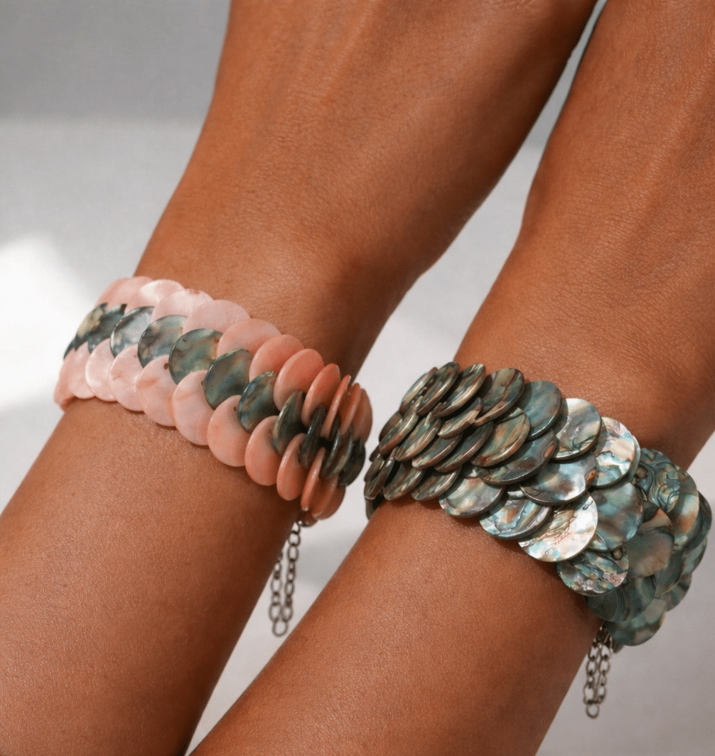 Laisse parler l’océan à ton poignet avec ces bracelets artisanaux en nacre rose et abalone ou tout abalone entièrement réalisé à la main.
